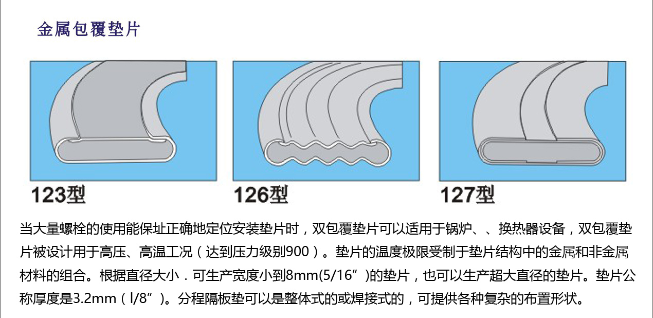 双包覆垫片(123,126,127型)填料完全由覆盖在内、外径及两侧接触面的两个金属套完全封闭。除了金属套被加工成波浪型以外,126型与123型相似,这样结构具有比123型更好的冲击韧性,因为垫片的波纹形状在法兰密封上形成多重密封。127型式两个反向壳体包覆的垫片,127型具有更好操作性和更好的耐高压性。