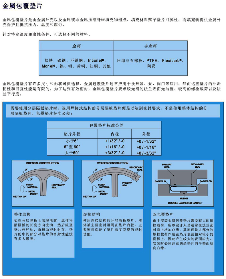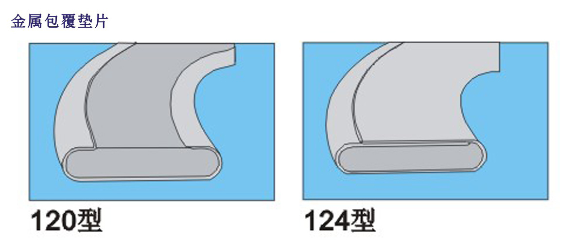 单包覆垫片(120,124型)填料包覆垫片内、外径的一个金属套封闭。120型具有一个接触面被覆盖,因此可使用于相对窄和圆与非圆形的布置结构。124型是搭接式单包覆垫片,填料被完全密封于内外径和两侧接触面中,更适用于宽度较窄的高温工况。典型的低压应用实例包括锅炉、压缩机、泵、柴油机、汽油内燃机等。120型垫片不推荐使用于标准管道法兰。最小法兰宽度为6.4mm(1/4“),垫片公称厚度为3.2mm(1/8“)。