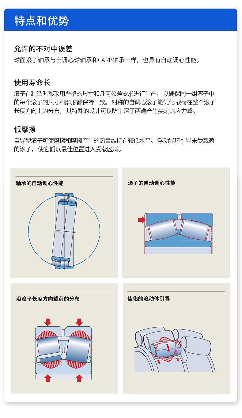 球面滚子轴承有两列对称滚子,外圈有一个共用的球面滚道,内圈有两个滚道,与轴承的垂直轴线成一定角度。外圈球面滚道的球心位于轴承轴线上。
