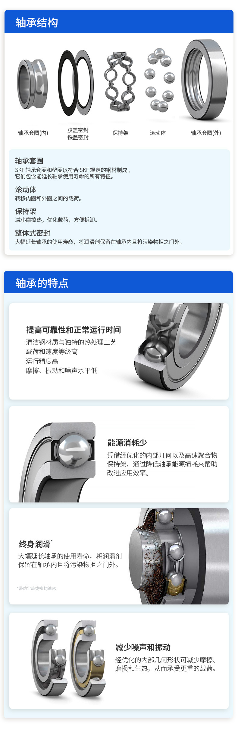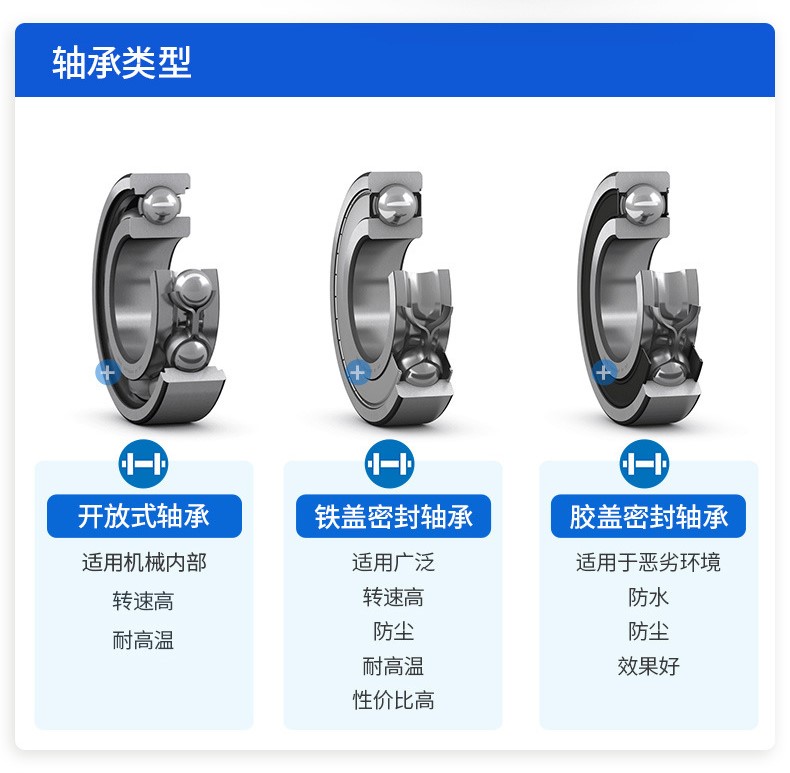 深沟球轴承是市场上使用较广的轴承类型。通用的设计使其成为径向和轴向负荷下高速运行时先选的解决方案。SKF 提供系列广泛的深沟球轴承,具有开放式、防护式和密封设计。防护和密封设计与开放式设计相比具有更多优点,因此成为很多应用的先选。两端均密封时,轴承终身润滑且无需维护、易于安装。