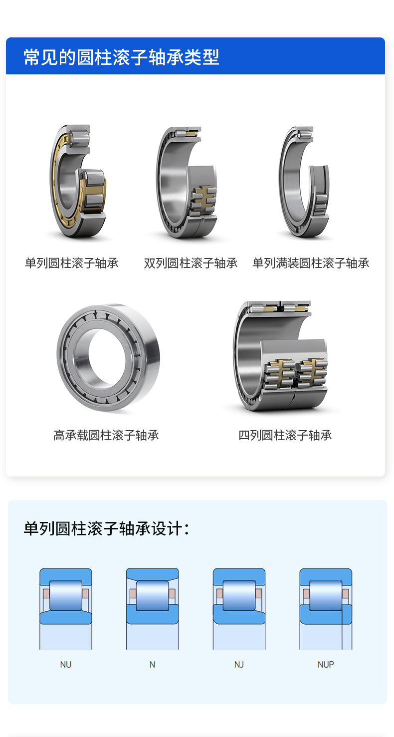 SKF圆柱滚子轴承有多种设计、系列、变型和尺寸。主要的设计差异在于滚子的列数和内圈/外圈法兰以及保持架的设计和材料。轴承能够应对径向重载和高转速的应用挑战。适应轴向位移(除了内圈和外圈都带法兰的轴承),它们提供高刚度、低摩擦和长使用寿命。圆柱滚子轴承还提供密封式或剖分式设计。在密封式轴承中,滚子有防污染、防水和防尘保护,将润滑剂保留在内的同时排除污染。这使得摩擦更低、使用寿命更长。剖分式轴承主要用于难以够到的轴承配置,例如曲轴,它们可以简化维护和更换