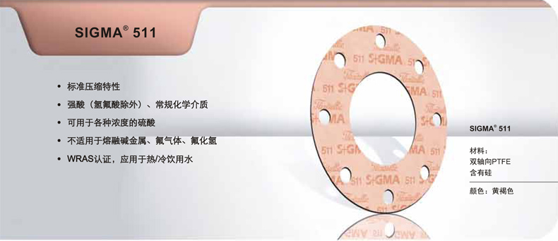 Sigma 511-以二氧化硅填料强化的标准压缩板材。适用于浓酸(除了氢氟酸)和绝大多数常见腐蚀性化学品及中等浓度的碱。