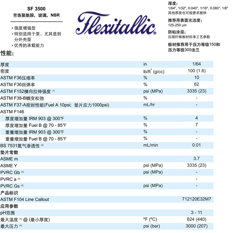 SF 3500 是一种压缩非石棉垫片材料,适用于机泵(含中开泵)。 它采用玻璃和聚芳基酰胺纤维加强层制作,并使用 NBR 粘接剂。