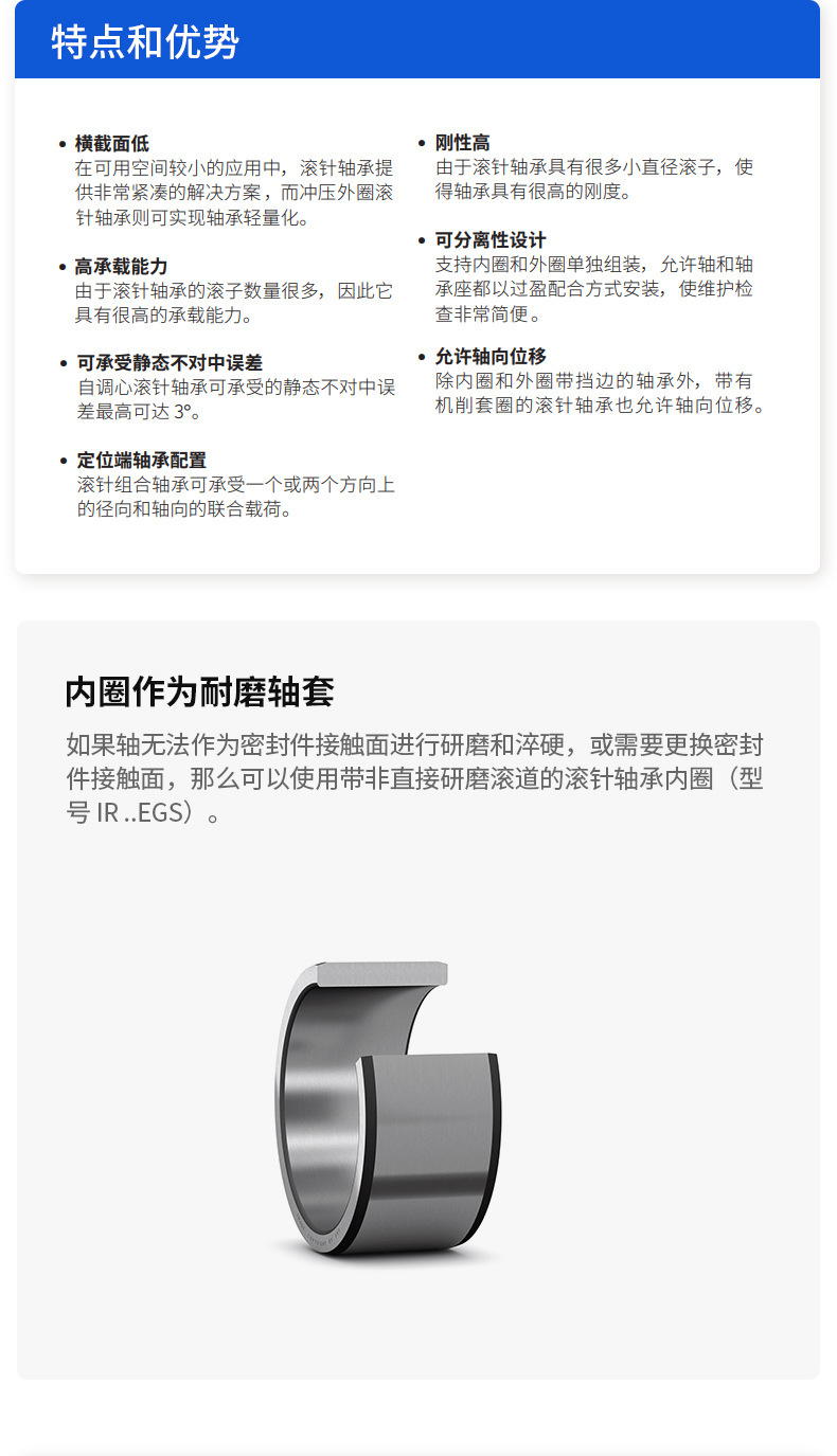 SKF滚针轴承是带有直径较小于长度的圆柱滚子的轴承。改进的滚子/滚道形状防止应力峰值,并延长轴承的使用寿命。SKF提供不同设计、不同系列和多种尺寸的滚针轴承,以满足各种工作条件和应用。